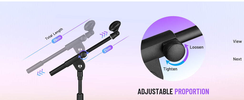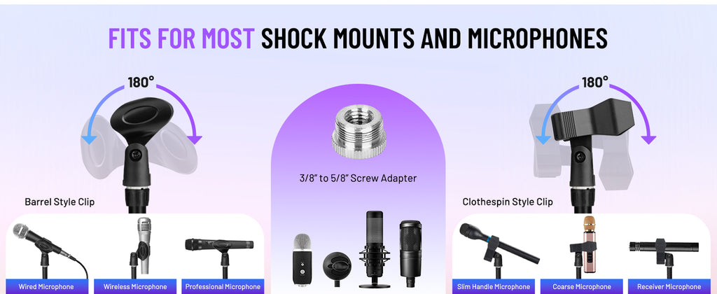4. Extendable Boom Arm: Telescoping boom arm extends from 8.2 to 15.3 inches, offering 180° rotation for precise positioning. The included adapter accommodates microphone diameters of 0.98-1.38 inches.