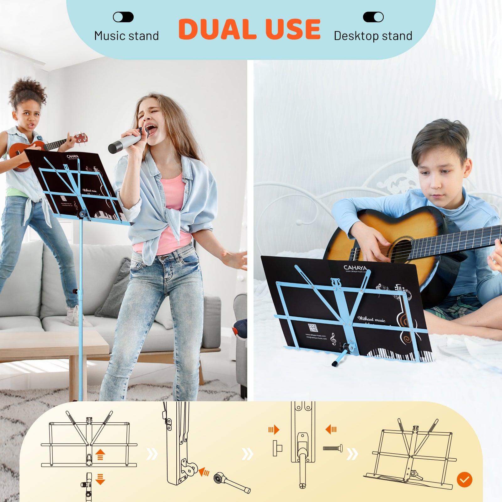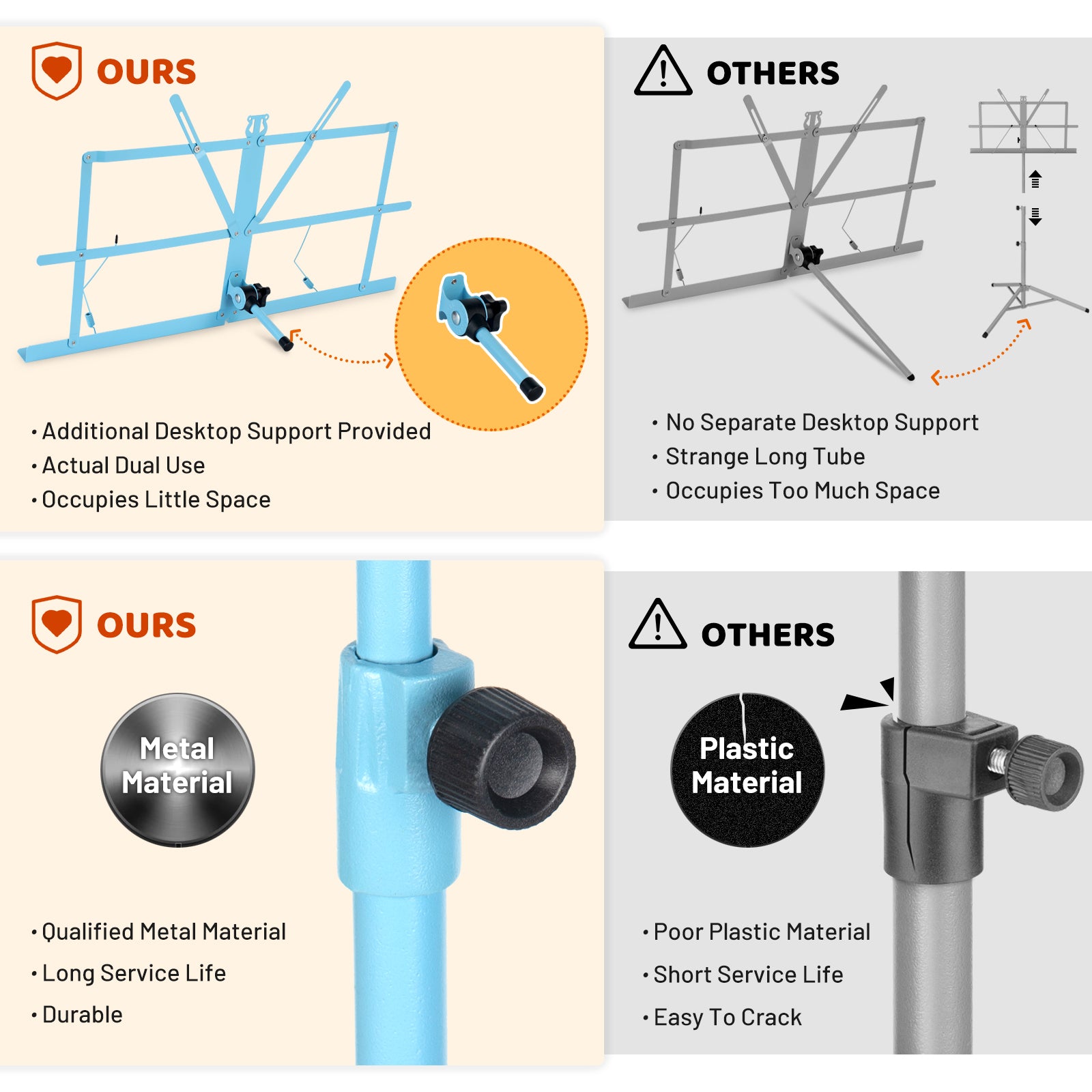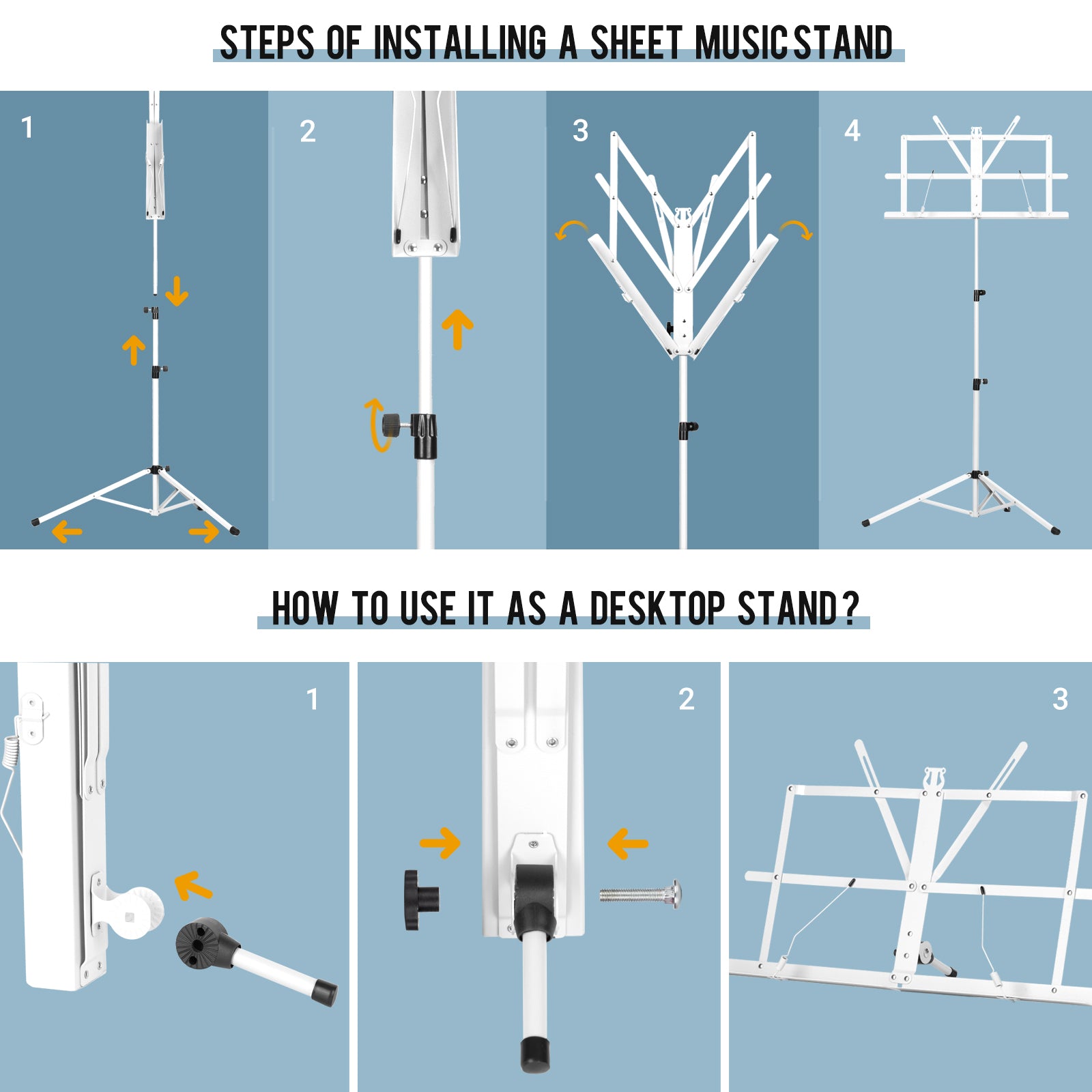 - 2in1 Dual Use Vertical Music Stand & Tabletop Stand: extra short support enables using it as a desktop sheet music books stand. Package Includes: Carrying Bag*1, Tripod*1, Folding Bookplate*1, Music Sheet Clip Holder*1, Desktop Support*1