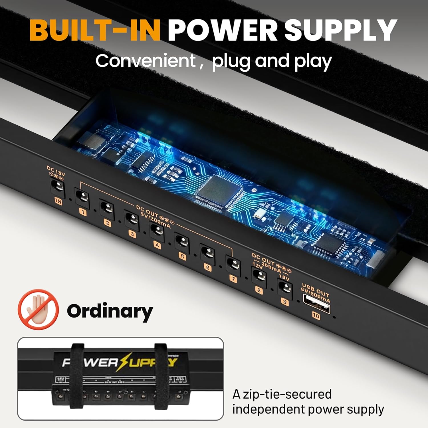 • Efficient Built-in Power Supply: The CAHAYA guitar pedal board features a power supply system that can power up to 10 devices simultaneously, easily meeting the demands of large-scale performances and multi-device cascading. The angled power connector layout not only makes wiring neater and more intuitive, but also reduces the risk of cable entanglement and accidental connections, allowing you to focus on your musical expression and enjoy a more professional live performance experience.