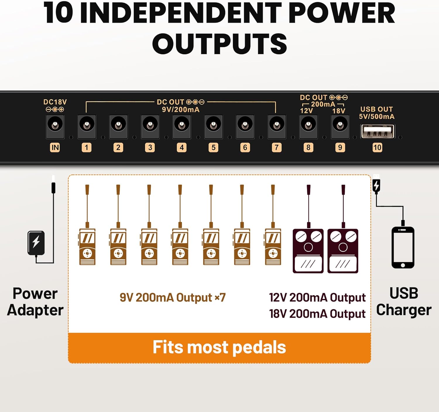 • Multiple Power Interfaces: This pedal board offers one 18V DC input and 10 outputs. 7 x 9V/200mA outputs, as well as independent 12V and 18V/200mA outputs, provide full compatibility with a wide range of effects pedals. An additional USB 5V/800mA port allows you to charge devices like smartphones, expanding your usage options.