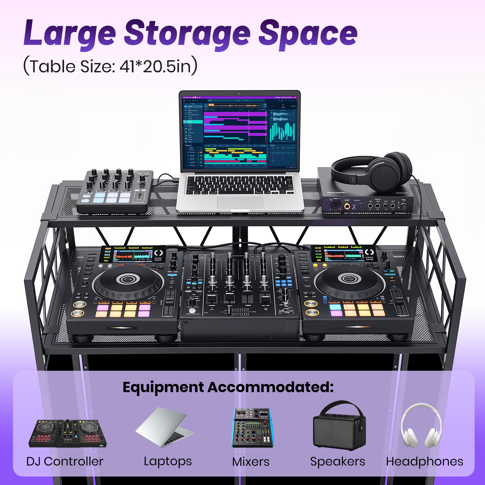- Spacious Dual-Tabletop Design: This professional DJ booth features a main surface (40.7" x 19.7") and a secondary tier (40.7" x 8.7") with two height settings, offering ample room for controllers, laptops, and mixers. Built-in cable holes and hidden channels keep wiring neat and organized.